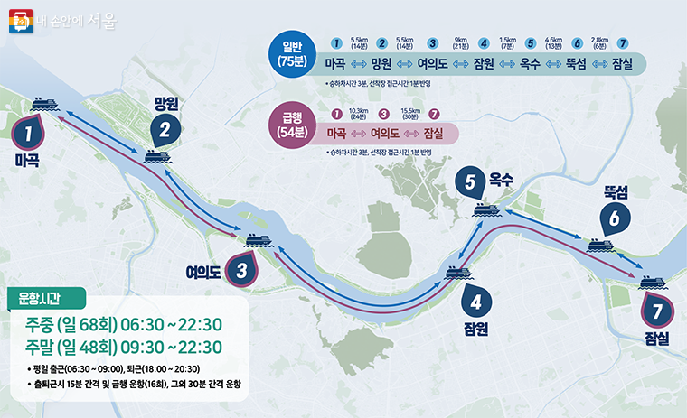 운항 시간은 평일 6시 30분~22시 30분(68회 운항), 주말과 공휴일 9시 30분~22시 30분 (48회 운항)