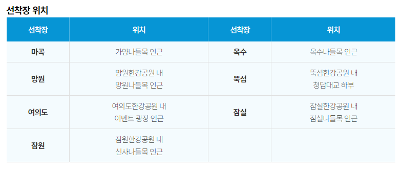 '한강 리버버스'는 마곡, 망원 여의도, 잠원 옥수, 뚝섬, 잠실 총 7개 선착장을 준비 중에 있습니다.